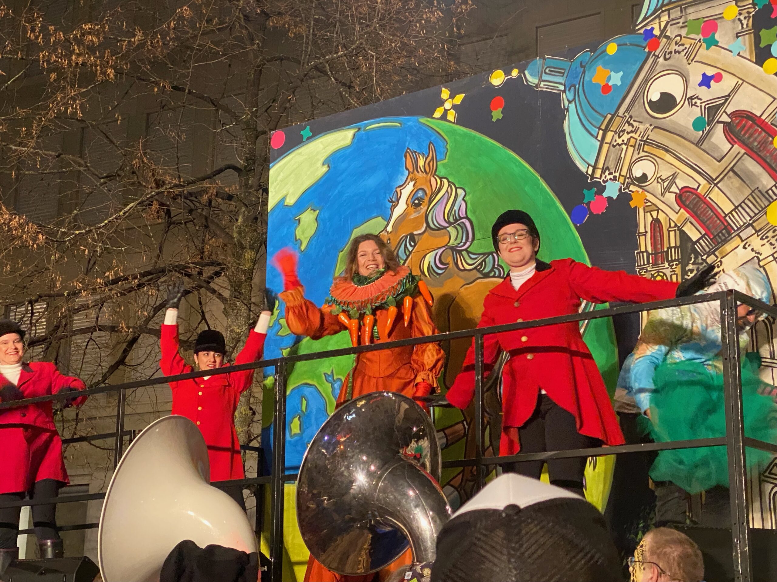 Nun ist die Katze aus dem Sack. Oder besser das Pferd aus dem Stall. Nayla Stössel ist die neue Ehren-Föbü. Und sie hat es verdient. Als Präsidentin des CSIO hat sie den St.Galler Grossanlass allen Widerständen zum Trotz in die weltweite Topliga gebracht. Das Reitturnier im Gründenmoos ist damit einer der wichtigsten internationalen Botschafter für St.Gallen. Als Rüebli verkleidet und begleitet von rotgekleideten Tänzerinnen führten die versammelten Föbüs die Verschusskandidatin zur Kanone vor dem Vadian. Die vom Theater St.Gallen einmal mehr wunderbar gestaltete Bühne liess erahnen, woher der Wind bläst. Flankiert wurden die sich verneigende Türme der Kathedrale von einem galoppierenden Pferd. Vor der Kanone hatte sich viel Volk versammelt. Die Anpassungen im Programm bewährten sich. Der Verschuss wurde eine Stunde vorverlegt und Ehren-Föbü Marius XXXVI. überbrückte die Zeit nach Ladenschluss bis zum Verschuss mit einem Kinderprogramm. Toll auch der Aufmarsch der Guggen. Selbst Berlin war vertreten.