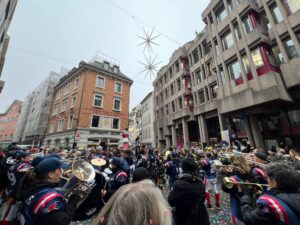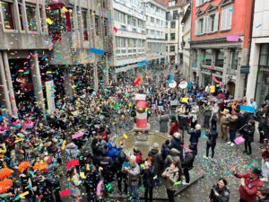 Zum zweiten Mal ist die St.Galler Fasnacht am 11.11. vor dem Fondue-Beizli in der Brühlgasse eröffnet worden. Lautstark, mit Freibier und weniger Publikum als vor einem Jahr. Die kleinere Fasnachtsschar und das neblig-trübe Wetter taten der guten Stimmung aber keinen Abbruch. Dies vor allem auch dank eines geballten Auftritts der Guggen aus Stadt und Region. Am Fasnachtsauftakt gaben alle Beteiligten Kostproben ihrer Kunst zum Besten. Die Schnitzelbänkler waren durch Gallus (alias alt Stadtrat Fredy Brunner) und seine bissigen Bemerkungen von der Stadtpolitik bis zur Fasnachtsprominenz vertreten. Für die Fasnachtsgesellschaft sprach Präsident Seger, während Ehren-Födlebürger (Föbü) Malcolm Green bei seinem auch schon traditionellen Auftritt mit dem Saxophon diesmal von Ehren-Födlebürgerin (Föbine) Geraldine Brot unterstützt wurde. Die Hauptrolle spielten aber wie immer laut und kakophonisch die Guggen. (Quelle: Reto Voneschen, Tagblatt, 11.11.2024)