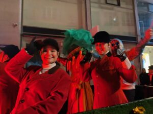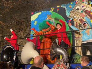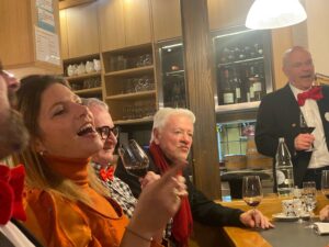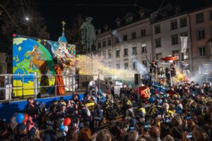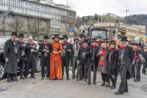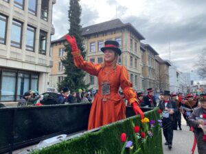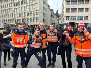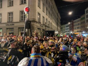 Am Sonntag gleich der erste Höhepunkt im jungen Föbü-Leben. Auf der Sänfte ging es mit dem Fasnachtsumzug durch die Innenstadt von St.Gallen. Begleitet von der versammelten Schar der Ehren-Föbüs, umjubelt von tausenden von Fasnächtlerinnen und Fasnächtlern und beschützt von gutgelaunten Polizisten. Zum Ausklang trafen sich die Föbüs wie gewohnt im Fonduebeizli und sangen für dieses Jahr zum letzten Mal: Es gwaggelet dä Dom ……
