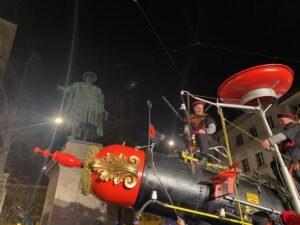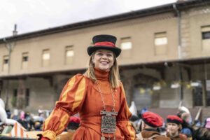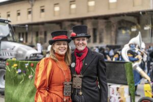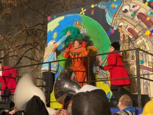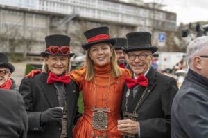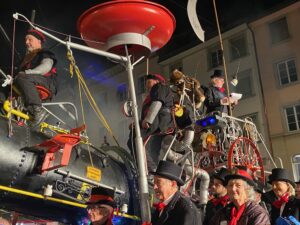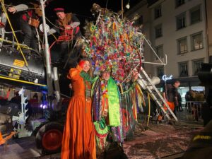 Nun ist die Katze aus dem Sack. Oder besser das Pferd aus dem Stall. Nayla Stössel ist die neue Ehren-Föbü. Und sie hat es verdient. Als Präsidentin des CSIO hat sie den St.Galler Grossanlass allen Widerständen zum Trotz in die weltweite Topliga gebracht. Das Reitturnier im Gründenmoos ist damit einer der wichtigsten internationalen Botschafter für St.Gallen. Als Rüebli verkleidet und begleitet von rotgekleideten Tänzerinnen führten die versammelten Föbüs die Verschusskandidatin zur Kanone vor dem Vadian. Die vom Theater St.Gallen einmal mehr wunderbar gestaltete Bühne liess erahnen, woher der Wind bläst. Flankiert wurden die sich verneigende Türme der Kathedrale von einem galoppierenden Pferd. Vor der Kanone hatte sich viel Volk versammelt. Die Anpassungen im Programm bewährten sich. Der Verschuss wurde eine Stunde vorverlegt und Ehren-Föbü Marius XXXVI. überbrückte die Zeit nach Ladenschluss bis zum Verschuss mit einem Kinderprogramm. Toll auch der Aufmarsch der Guggen. Selbst Berlin war vertreten.